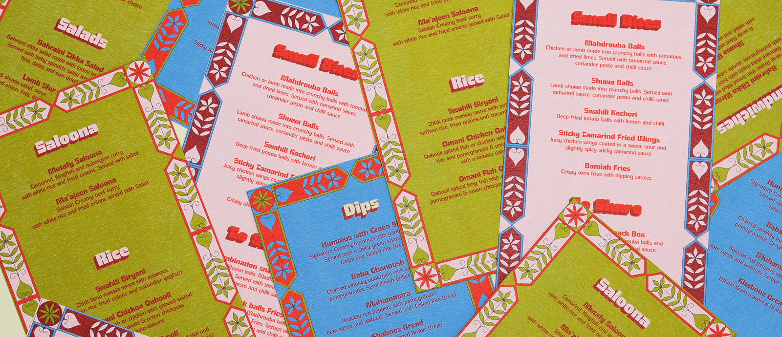 The name ‘Farsha,’ meaning a table spread or buffet enjoyed during family gatherings and celebrations, guided the narrative of the brand. At Studio Sein, we worked on building Farsha’s visual identity with a focus on storytelling, local heritage, and contemporary design. Our vision was to create a brand that feels welcoming, familiar, and vibrant. Just like sitting at a bustling Omani family table.