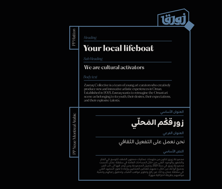 Central to Zawraq’s identity is the significance of its name: Zawraq means “boat.” The organization’s motto, “Your local lifeboat,” underscores its mission to guide emerging artists in Oman as they navigate the creative industry, providing opportunities, funding, and organizational support. We strove to incorporate these ideas into the Arabic lettering of the new logo, visually depicting boats docked side by side to emphasize a sense of community and collective belonging.